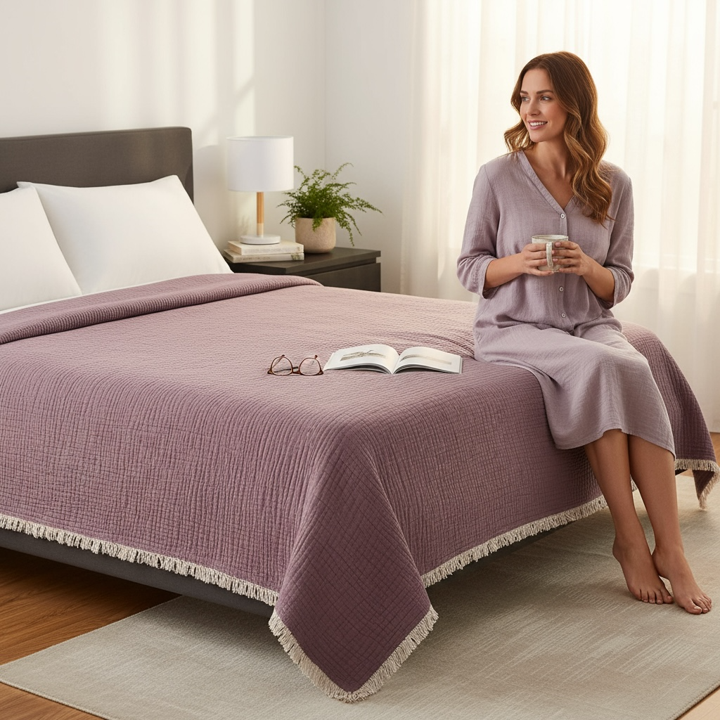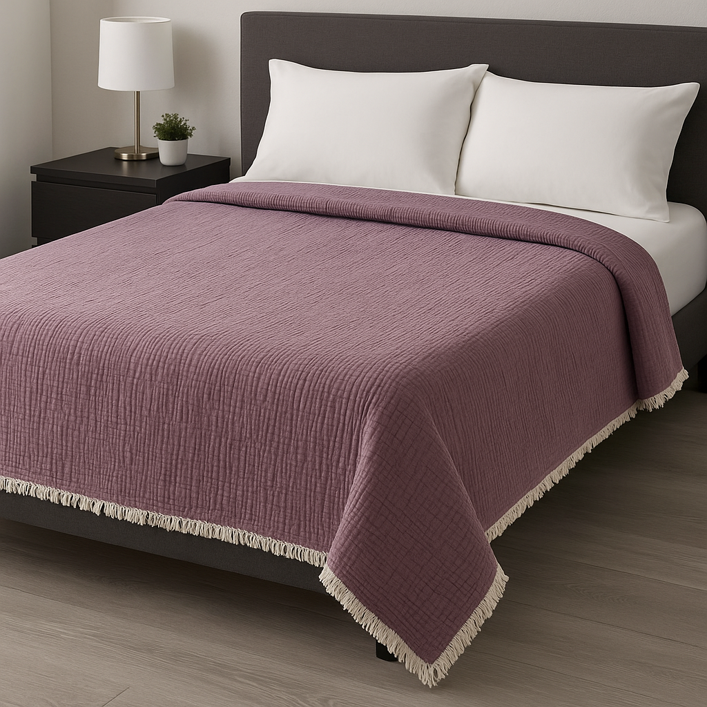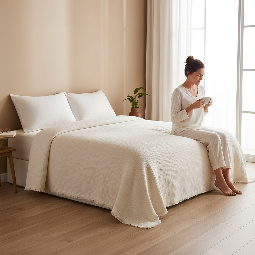 Konforun ve şıklığın bir araya geldiği Bulut Dokunuşu, sizi uykunun en yumuşak haline davet ediyor. %100 doğal 4 kat müslin kumaş ile 3 kat hafif iplik elyaf dolgudan oluşan bu özel tasarım, yatak odanıza zarafet katarken vücudunuzu yumuşacık bir sıcaklıkla sarar.