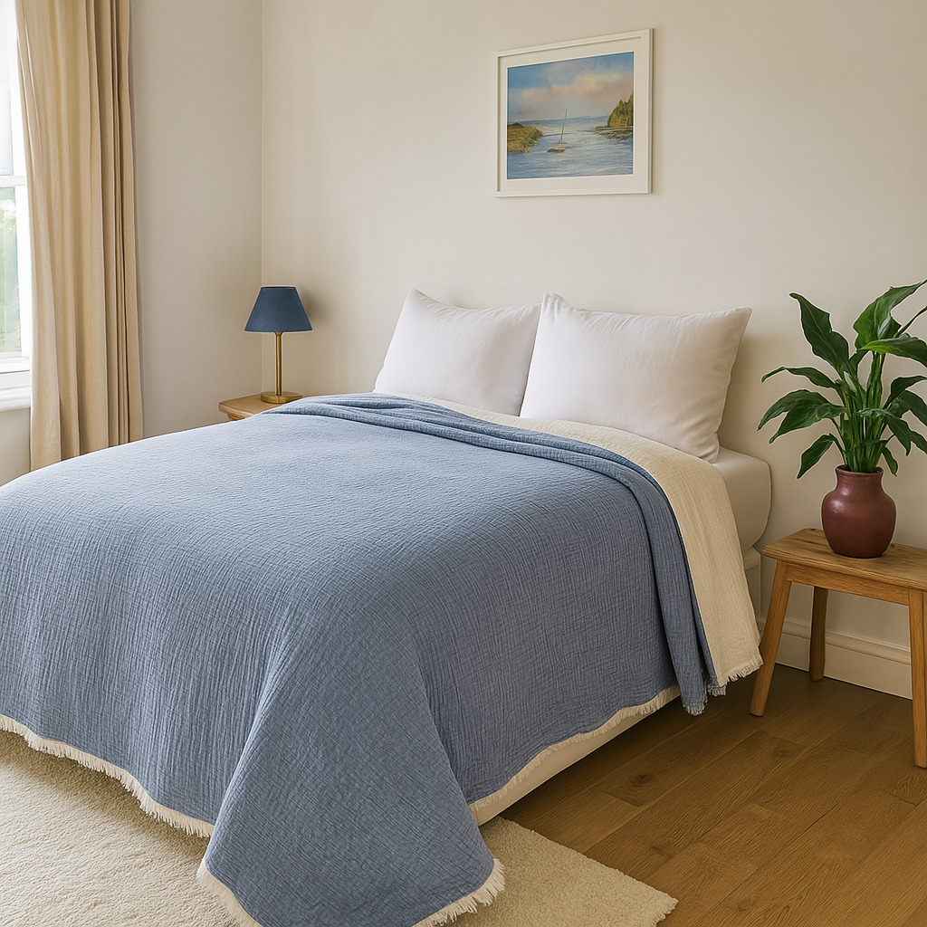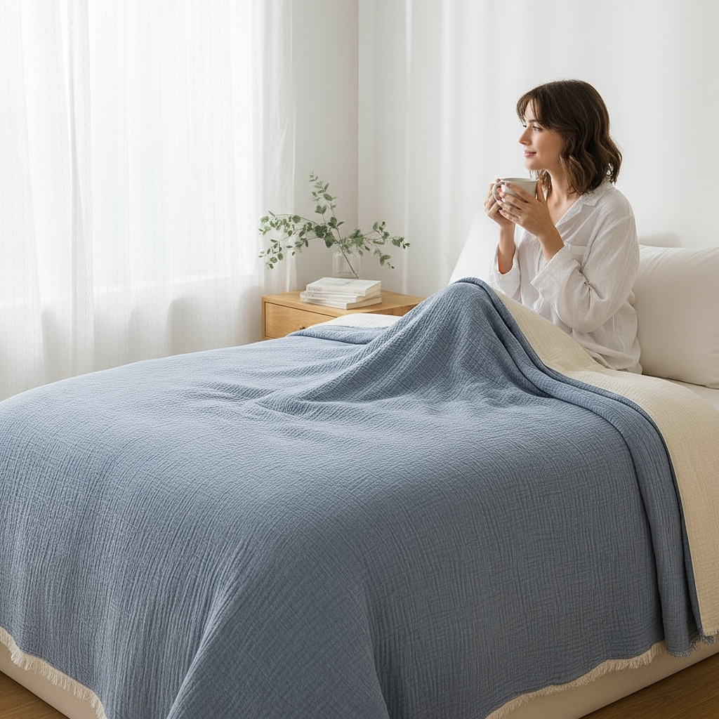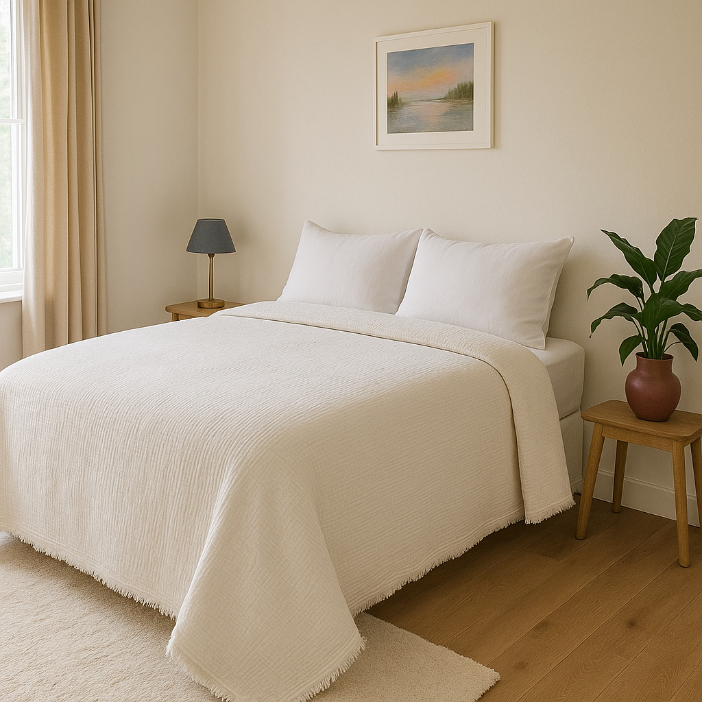 Konforun ve şıklığın bir araya geldiği Bulut Dokunuşu, sizi uykunun en yumuşak haline davet ediyor. %100 doğal 4 kat müslin kumaş ile 3 kat hafif iplik elyaf dolgudan oluşan bu özel tasarım, yatak odanıza zarafet katarken vücudunuzu yumuşacık bir sıcaklıkla sarar.